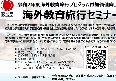 国土交通省の外局である観光庁は、海外教育旅行セミナー【令和7年度海外教育旅行プログラム付加価値向上事業】を12月17日に開催する。